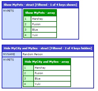 <cfdump var="#myVariable#" show="MyPets" label="Show MyPets" /><cfdump var="#myVariable#" hide="MyCity,MySex" label="Hide MyCity and MySex" />