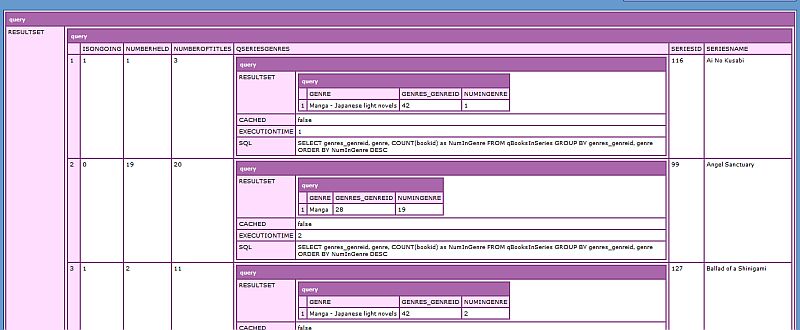 So my solution? A query within a query. Yes, within, not be confused with query of queries. Basically, in the gateway, I loop through my series, get the genres for each (ordered nicely by most prominent even), then add the entire query as a value with the query. On the output side, as I'm outputing the main query, I loop over the subquery, without having to actually break my model by putting a query within my view. What would such a beast look like? Well, if you cfdumped it, something like this: