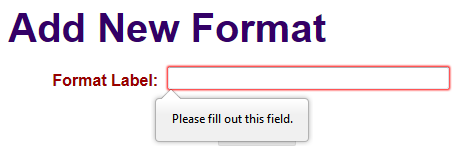 For this form, of course, it is just that the field is required. To confirm it works fine in non-HTML5 browsers, just remove the 'required' => 'required', attribute from the formatlabel add array in FormatsForm.php.