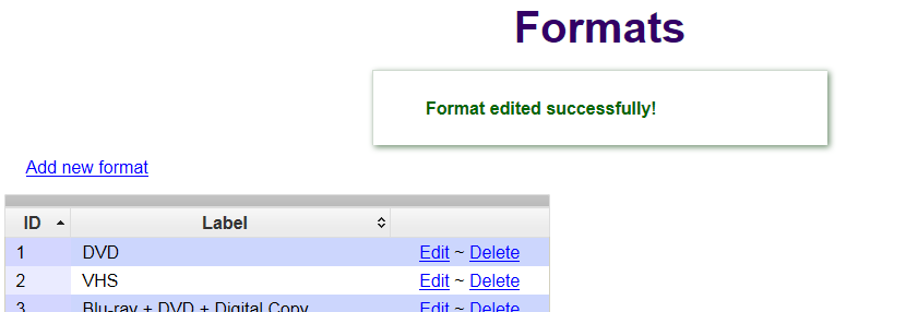 With that, my basic formats "crud' is complete. I can now view a list of formats, add new ones, edit existing ones, and delete them. Next, I'm going to go ahead and basically repeat these steps for the other basic tables of the site, i.e. genres, studios, and series. In my next post, I'll probably look at the series stuff a bit more, as it has a few more fields and when editing it, I want to be able to see what titles I have in that series and maybe be able to add/remove titles. ๐